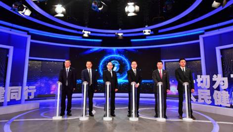 宋院士与温州市卫健委党委书记、主任陈宏鸣,温州广播电视传媒集团党委书记、总裁黄建省,温州市卫健委党委委员、二级调研员龚军俊,栏目合办单位代表浙江合心数字传媒有限公司总经理林建武,栏目协办单位颐影健诊CEO郭王达一起上台参与启动仪式。