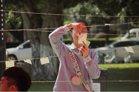 早上7点,伴着清晨的第一缕阳光,同德楼前的广场渐渐地热闹了起来。搭帐篷、放桌子、摆资料,裸舞 心萤志愿者们有条不紊地为活动做着前期的准备。本届活动的内容较往年更加丰富与升级,推出了绿丝带领取、九型人格测验、心理宣泄墙、房树人、心晴便利贴、心理知识问答、知觉小游戏、Oh卡以及线上集赞等九个小游戏。“‘Oh卡’是我们这次推出的新活动。我们进行了专门的培训,包括我们的‘房树人’,也是参加过线下的讲座。我们会在过程中观察绘画的人的表情与反应,参加过的同学反馈也是不错的。”一位忙碌着的志愿者介绍道。每款小游戏都有着它独立的作用:“宣泄墙”是对过往的叹息与对未来的展望,“Oh卡”是对内心的解读与探索,“房树人”向我们描绘了画与人结合的心灵蓝图……丰富多彩的心理游戏让路过的学生们纷纷驻足,跃跃欲试地想要参与其中。而亲身参与过之后,大家无不表示出惊喜的神情。
